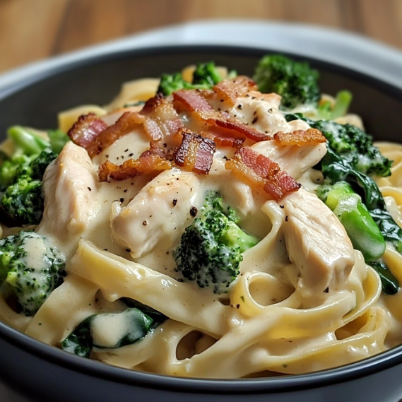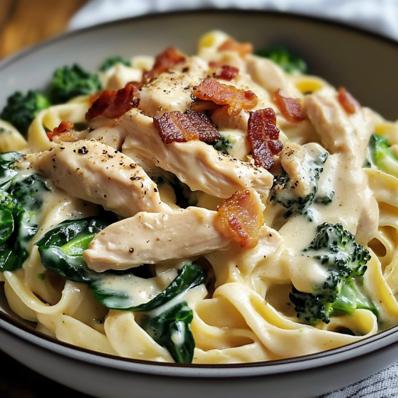Creamy Chicken Turkey Bacon Fettuccine Alfredo with Spinach & Broccoli