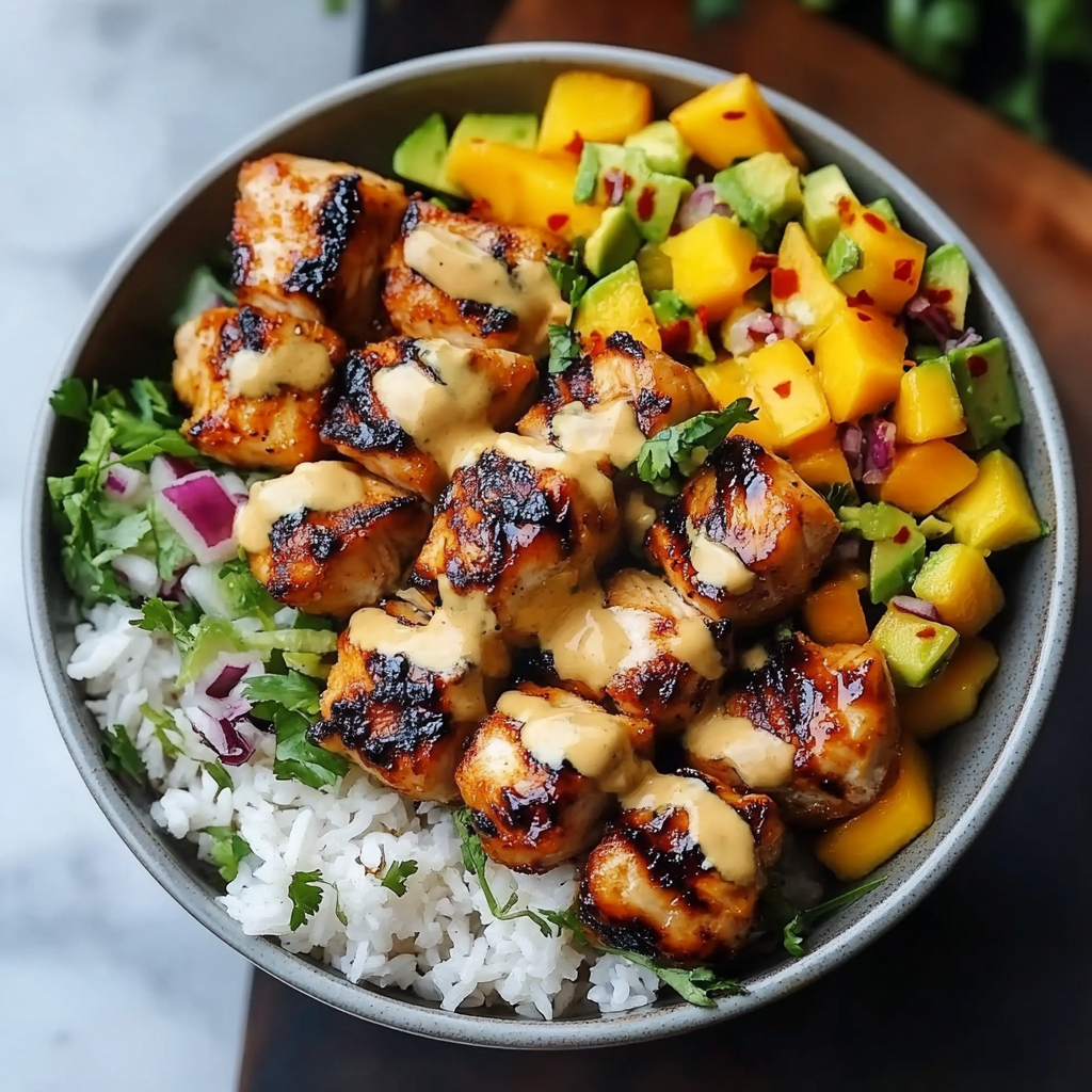 Grilled Maple Sriracha Chicken Bites with Coconut Rice & Mango Avocado Salsa Bowl with Chili Mayo is a delicious and vibrant meal that combines sweet and spicy flavors. This dish is perfect for various occasions, from family dinners to meal prep, offering a unique blend of textures and tastes that everyone will love.