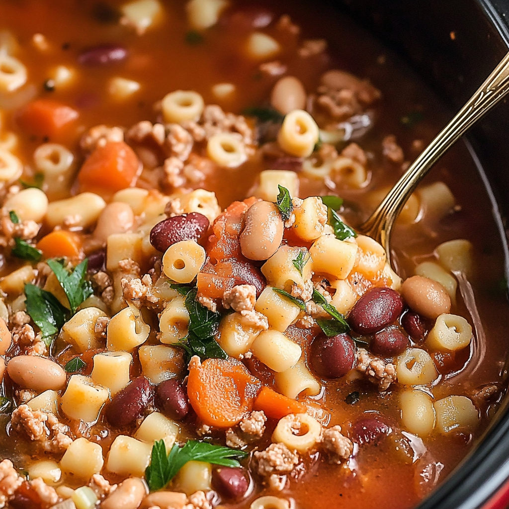Make a simplified version of Slow Cooker Pasta e Fagioli, an Olive Garden favorite, right at home! Ground beef, pasta, and beans cooked for hours in a rich, savory broth smell just as good as it tastes. This dish is perfect for busy weeknights or cozy family gatherings, offering a delicious blend of flavors that will warm your heart and fill your belly.