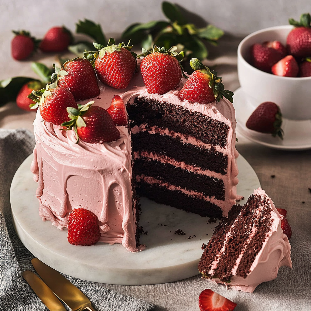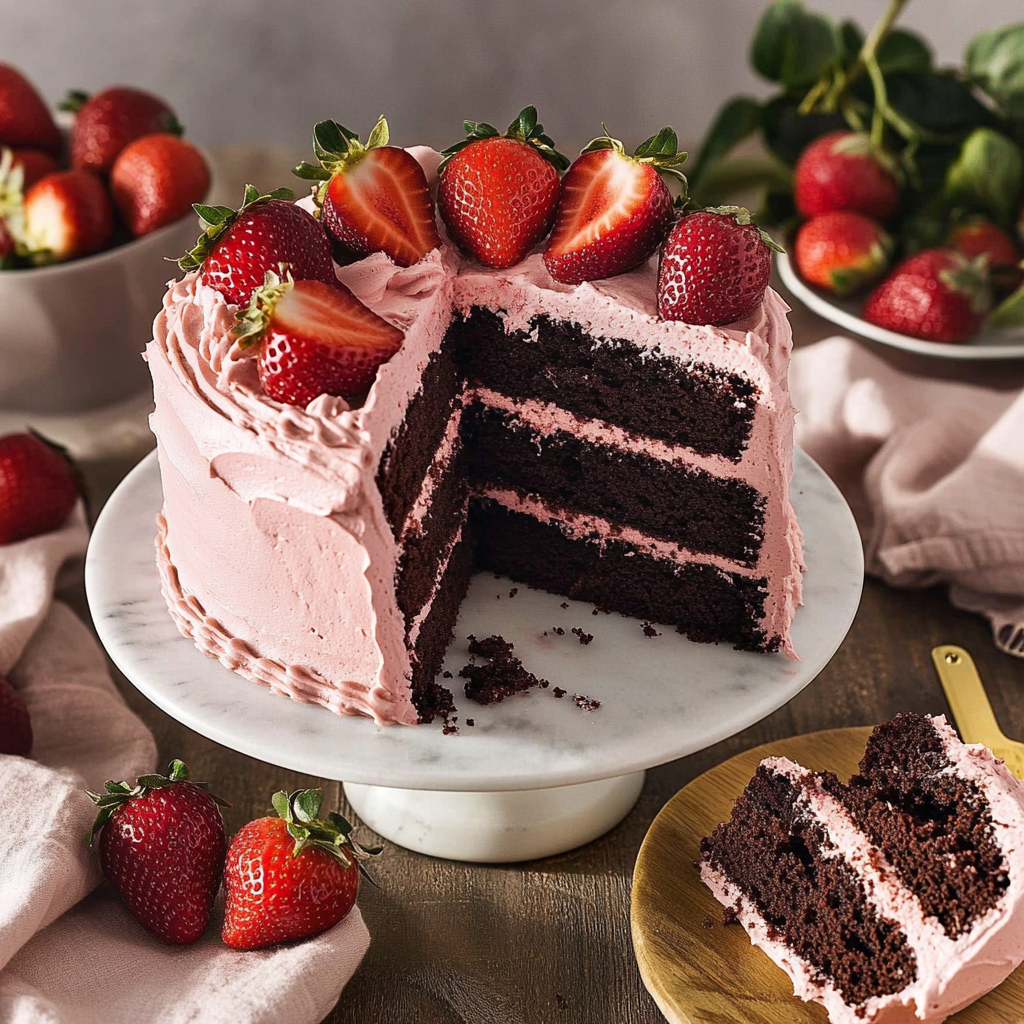 Strawberry Chocolate Cake is a rich dessert combining layers of chocolate cake with strawberry filling and cream cheese frosting, perfect for any occasion.