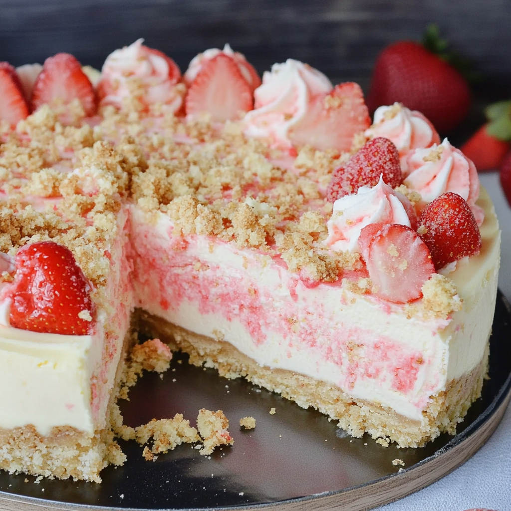 Strawberry Crunch Cheesecake is a no-bake dessert that combines creamy cheesecake with layers of strawberry flavor and crunchy cookie topping. It’s perfect for summer gatherings!